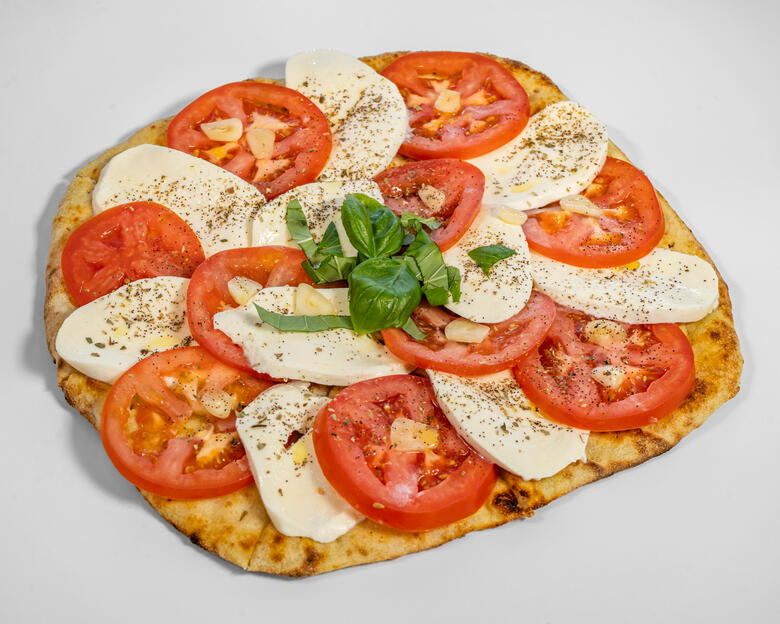 Sliced tomatoes, Fior Di Latte, arugula, basil, balsamic vinegar, olive oil.