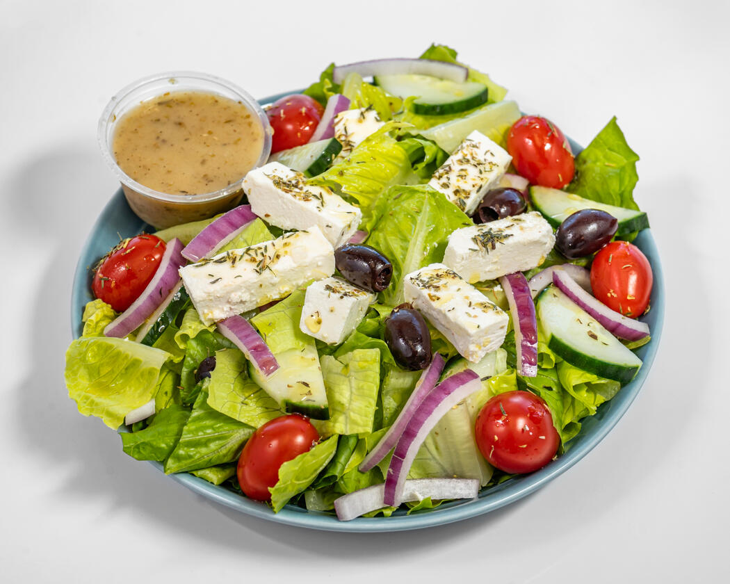 Romaine lettuce, Cherry tomatoes, cucumber, red onions, kalamata olives, feta, oregano, Greek dressing.