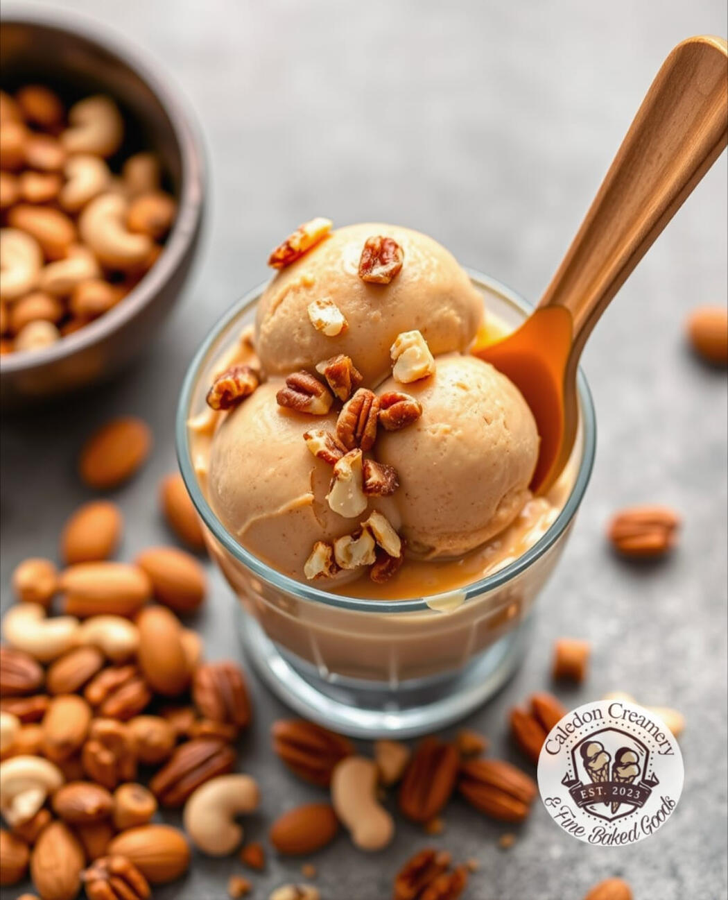 Ingredients: Heavy Cream (35%), Evaporated Milk, Sugar, Lactose, Nut Blend (cashews, almonds, pecans, Brazil nuts and macadamia nuts, Peanut Oil), Maple Syrup, Brown Sugar, Pure Vanilla Extract. Contains: Milk, Tree Nuts, Peanuts. May Contain: Egg, Gluten, Soy